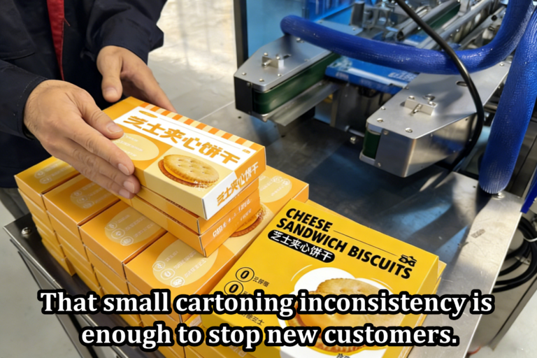 | Food | Biscuit / Snack Factory | Secondary Packaging (Cartoning) | Hidden bottleneck and unclear capacity | Automatic Cartoning Machine |