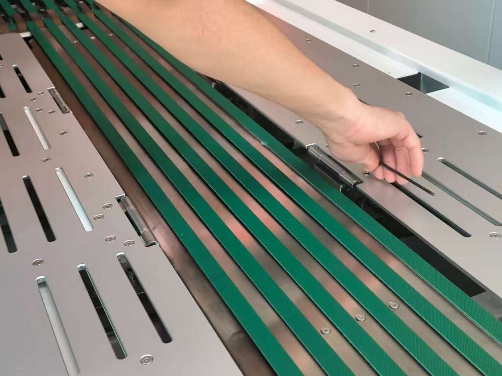 Next, check the conveyor belt. Adjust the control knob if the belt’s tightness is uneven. Replace the entire belt set if it looks worn out, so clothes won’t shift during feeding.