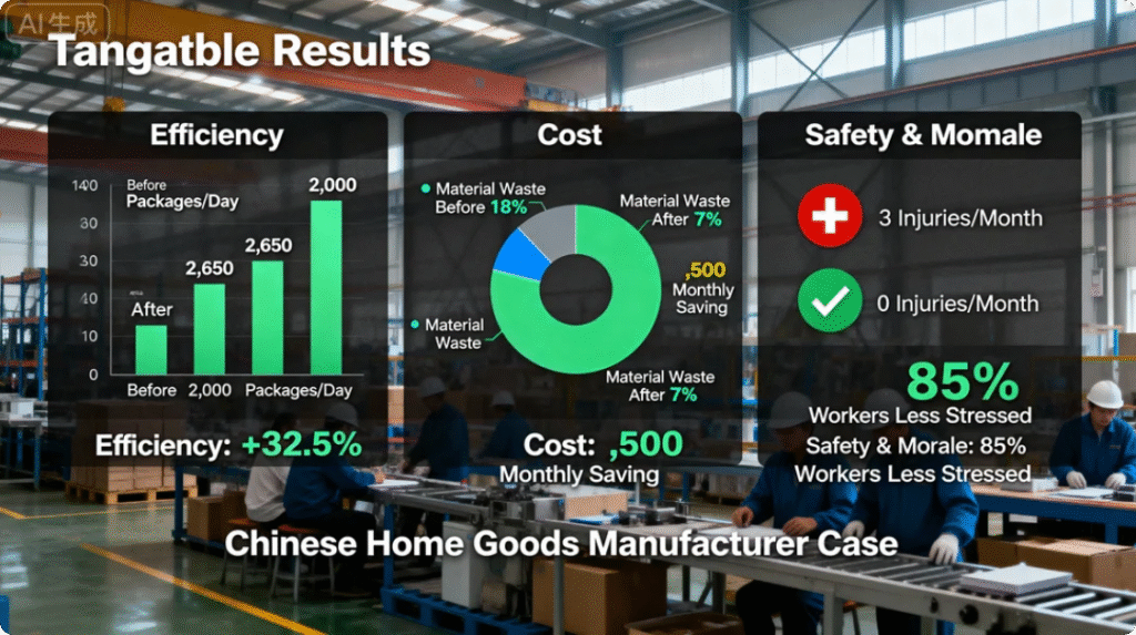 - Efficiency: Daily output rose to 2,650 packages—a 32.5% increase, exceeding the 30% target.