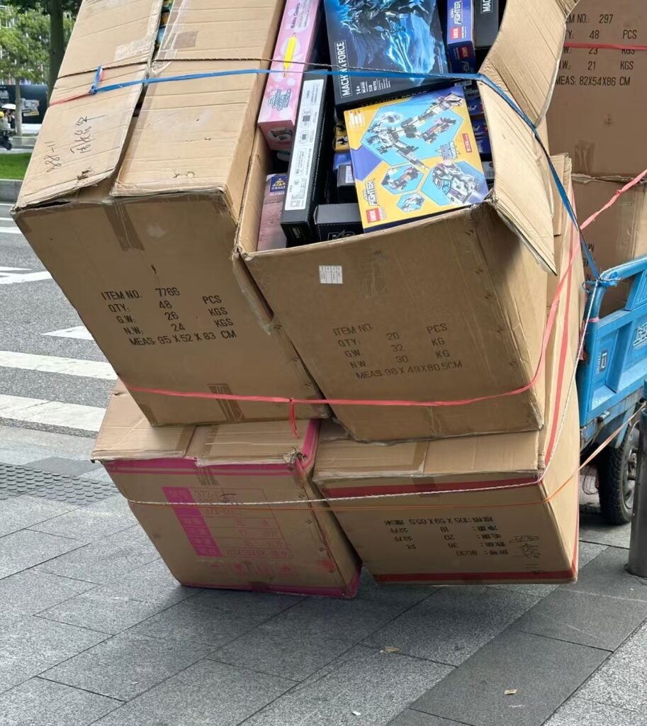 Stacks of toy cartons lean like they’re about to collapse.